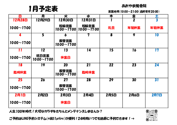 | 10:00~21:00 | ○ | / | ○ | ○ | ○ | ○ | / |
